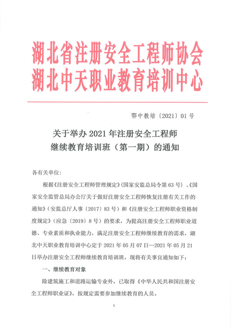 关于举办2021年注册安全工程师继续教育培训班(第一期)的通知