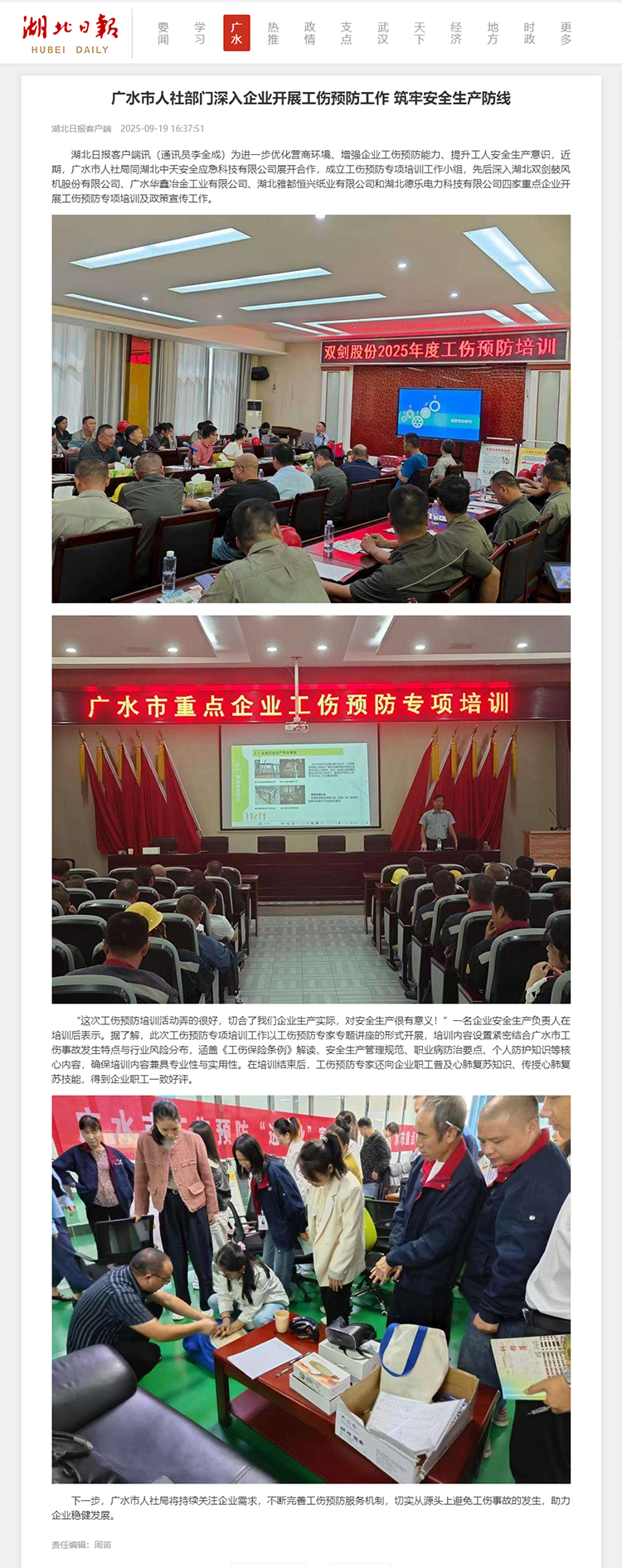 为进一步优化营商环境、增强企业工伤预防能力、提升一线职工工伤预防意识,近期,广水市人社局会同湖北中天安全应急科技有限公司,成立工伤预防专项培训工作小组,先后深入湖北双剑鼓风机股份有限公司、广水华鑫冶金工业有限公司、湖北雅都恒兴纸业有限公司和湖北德乐电力科技有限公司四家重点企业开展工伤预防专项培训及政策宣传工作。