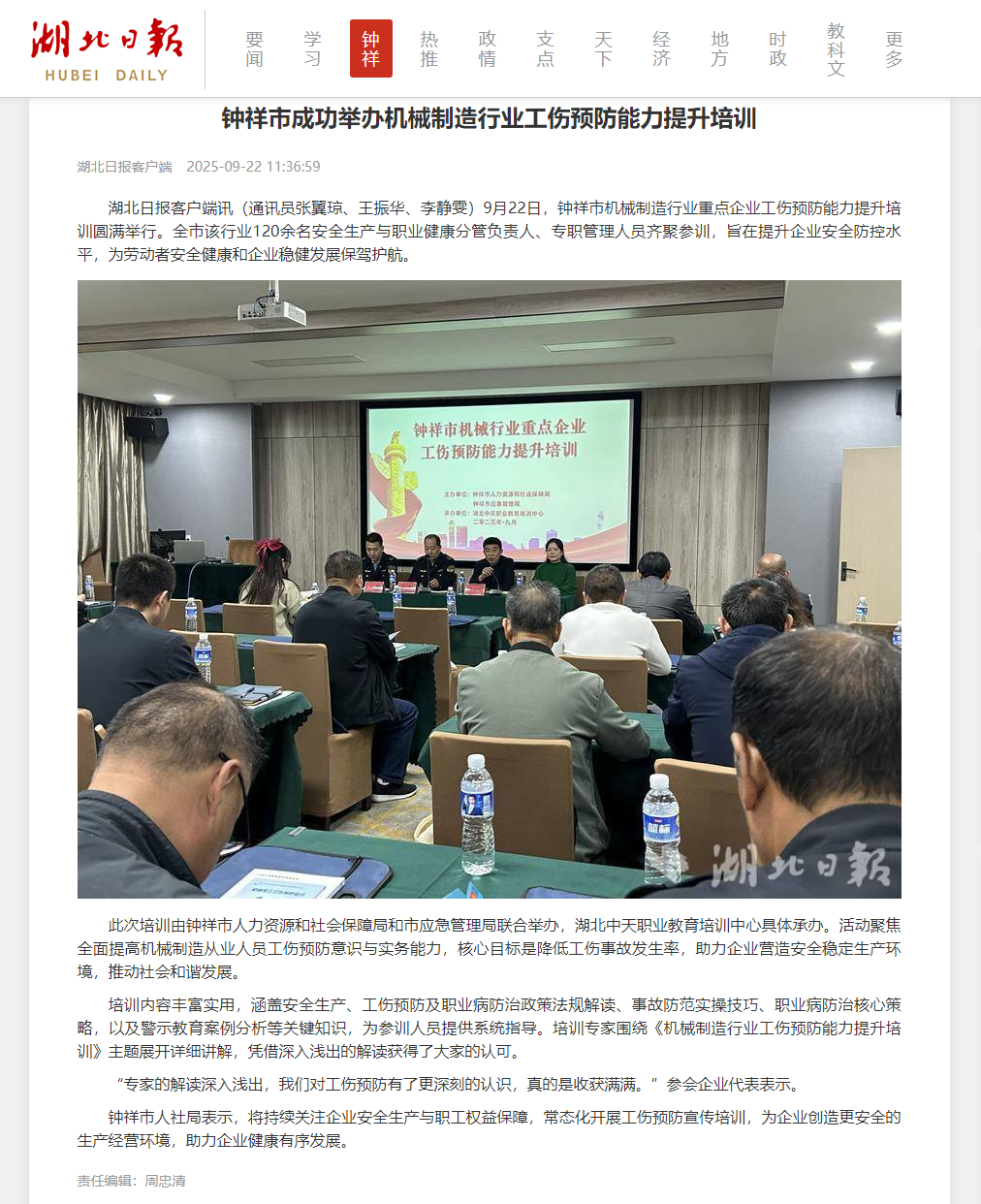 9月22日,钟祥市机械制造行业重点企业工伤预防能力提升培训圆满举行。全市该行业120余名安全生产与职业健康分管负责人、专职管理人员齐聚参训,旨在提升企业安全防控水平,为劳动者安全健康和企业稳健发展保驾护航。