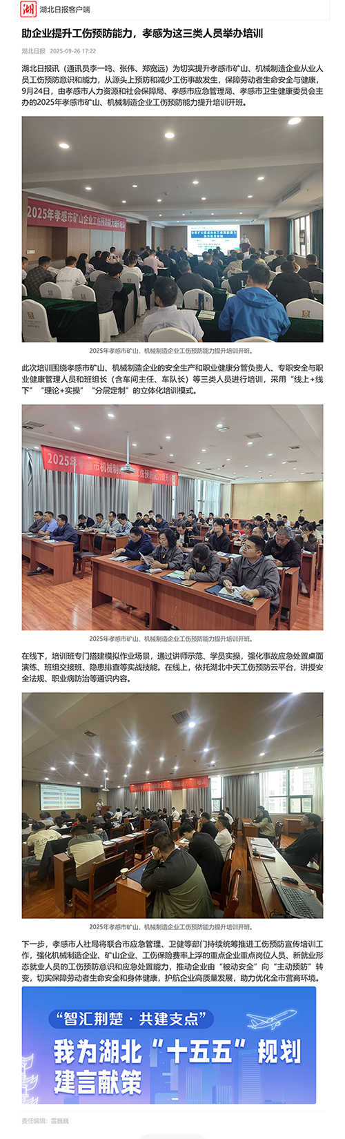 为切实提升孝感市矿山、机械制造企业从业人员工伤预防意识和能力,从源头上预防和减少工伤事故发生,保障劳动者生命安全与健康,9月24日,由孝感市人力资源和社会保障局、孝感市应急管理局、孝感市卫生健康委员会主办,湖北中天安全应急科技有限公司承办的2025年孝感市矿山、机械制造企业工伤预防能力提升培训开班,矿山行业参训人数55人,机械制造行业参训人数45人。