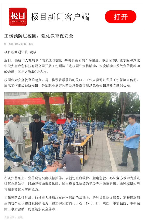 校园作为安全教育的起点,是工伤预防最前沿的关口。9月20日,仙桃市人社局以“普及工伤预防 共筑和谐仙桃”为主题,联合仙桃职业学院和湖北中天安全应急科技有限公司开展工伤预防“进校园”宣传活动,本次活动共发放宣传资料2000余册,参与人数500余人次。