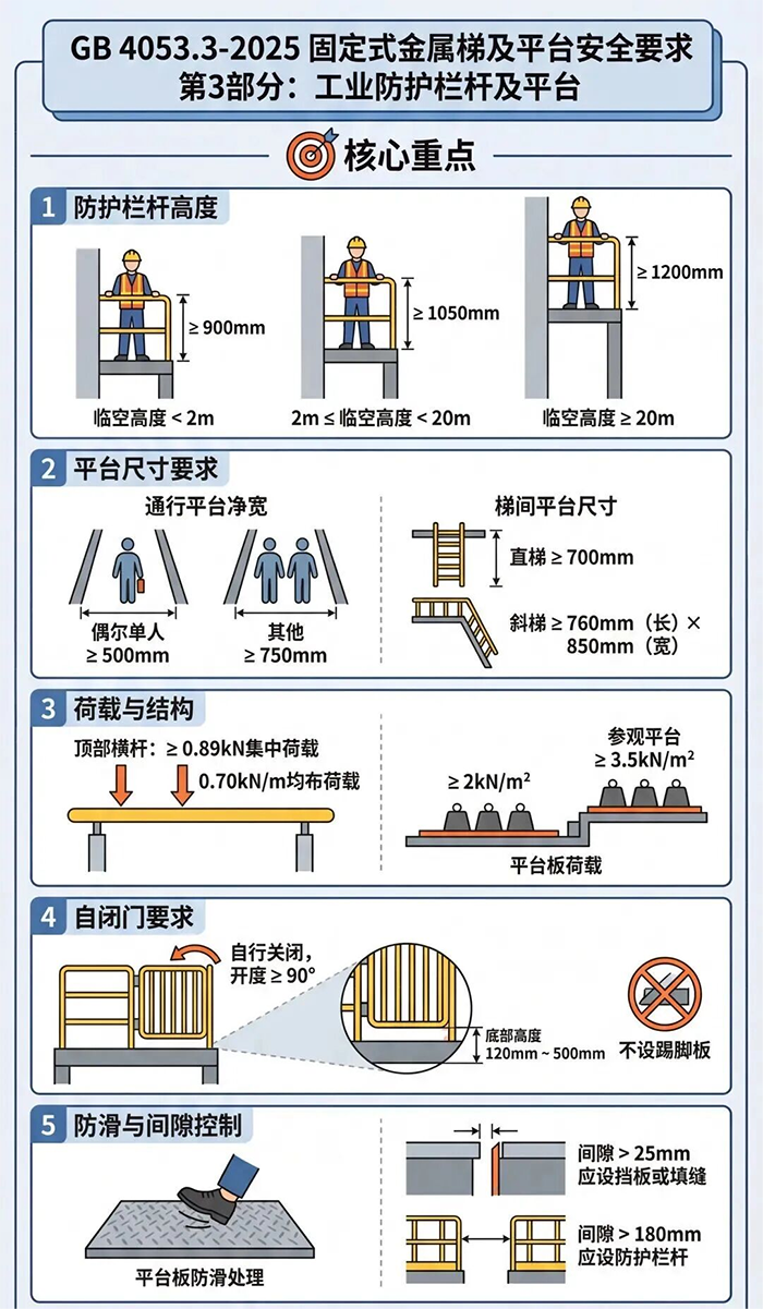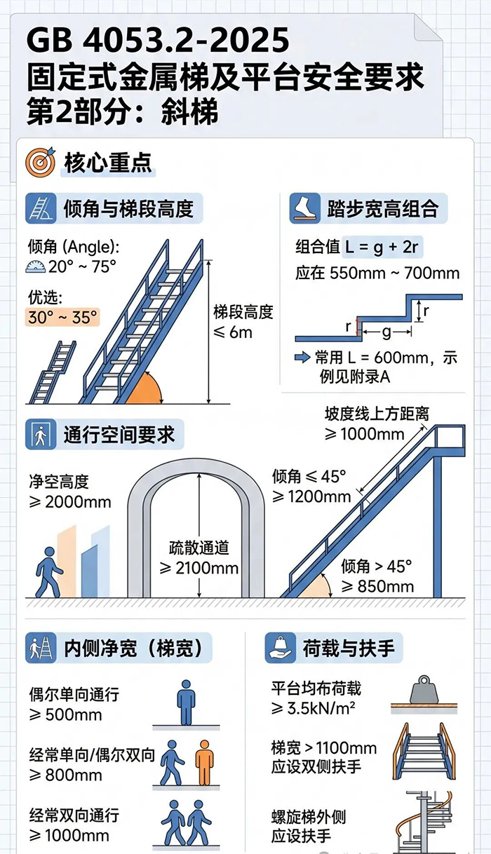 GB4053-2025《固定式金属梯及平台安全要求》为工业场所固定式金属梯及平台安全设计国家标准。该标准于2025年12月31日发布,2027年1月1日正式实施。其取代2009年旧版标准,主要针对直梯、斜梯及工业防护栏杆与平台的安全要求进行全面更新与细化。