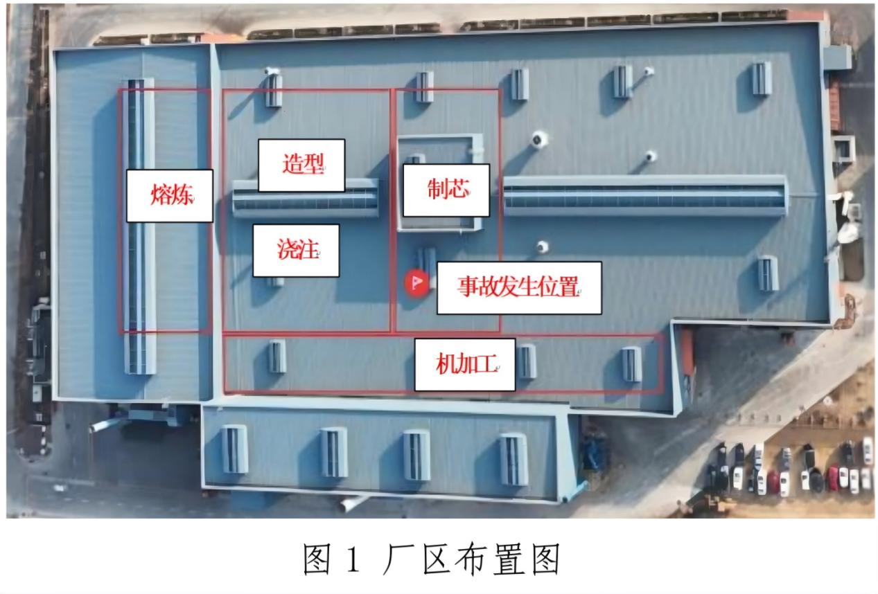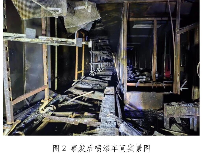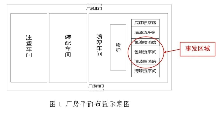 企业主要生产工艺为注塑、装配、喷漆、成品,事故发生于喷漆车间,过火面积约170平方米。厂房平面布置示意见图1,事发后喷漆车间实景照片见图2。