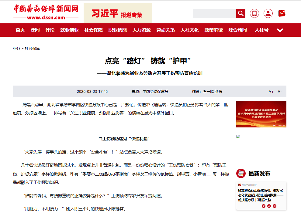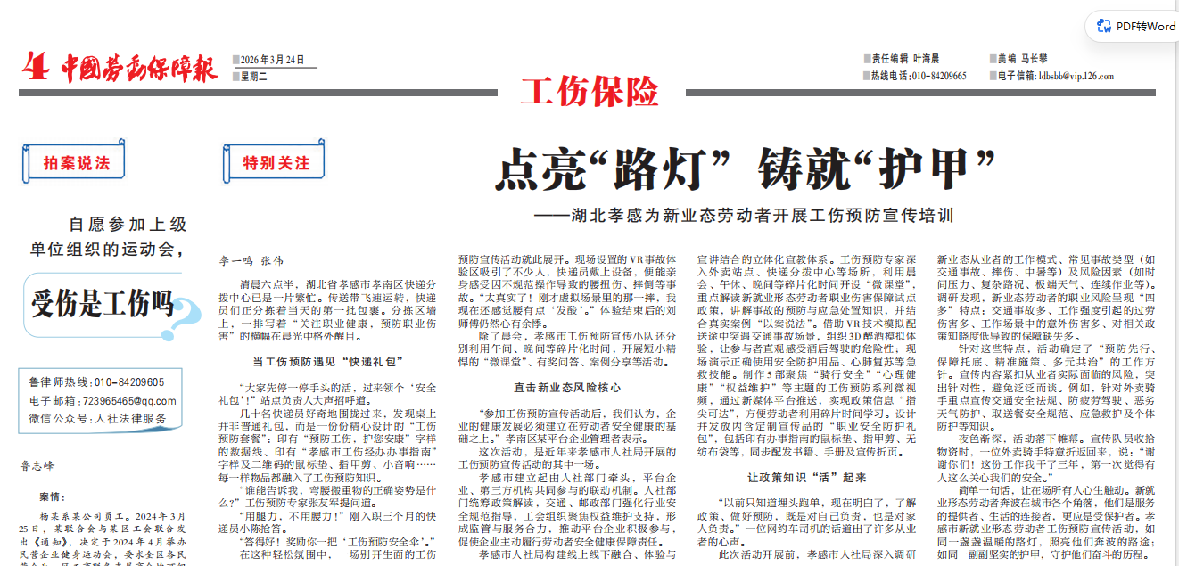 二、中国劳动保障报 | 点亮“路灯” 铸就“护甲”--湖北孝感为新业态劳动者开展工伤预防宣传培训