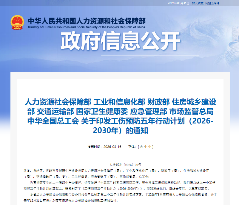 3.人力资源社会保障部等9部门关于印发工伤预防五年行动计划(2026-2030年)的通知(来源:人社部官网)