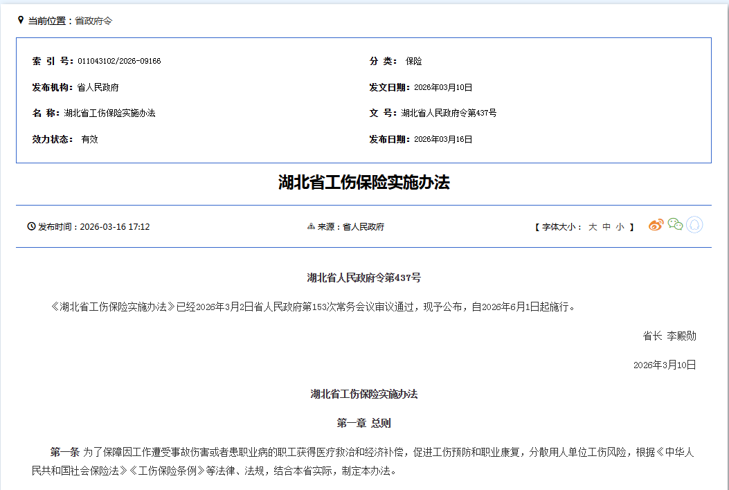 2026年3月2日,省人民政府第153次常务会议审议通过《湖北省工伤保险实施办法》。2026年3月10日,李殿勋省长签署省政府437号令予以公布,自2026年6月1日起实施。