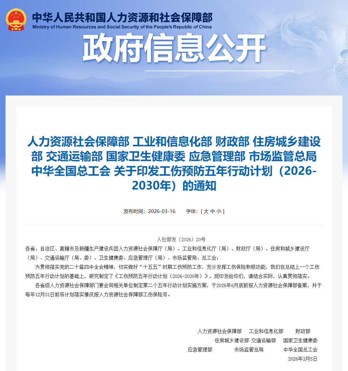 人力资源社会保障部等九部门印发工伤预防五年行动计划(官方全文)