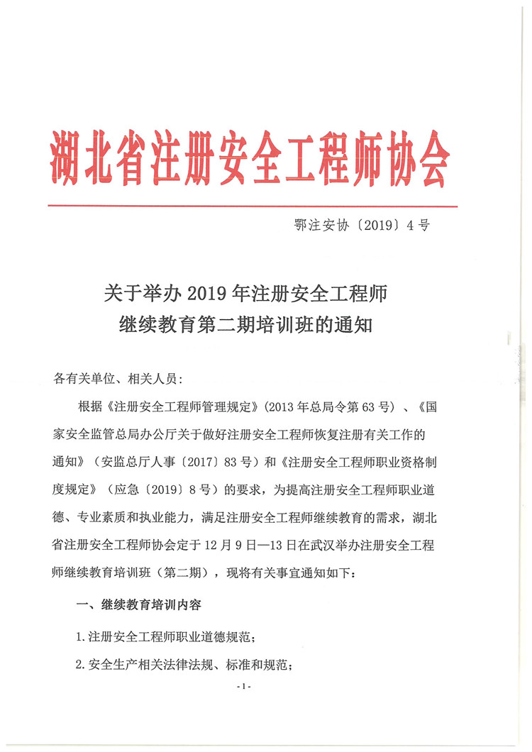关于举办2019年注册安全工程师继续教育第二期培训班的通知
