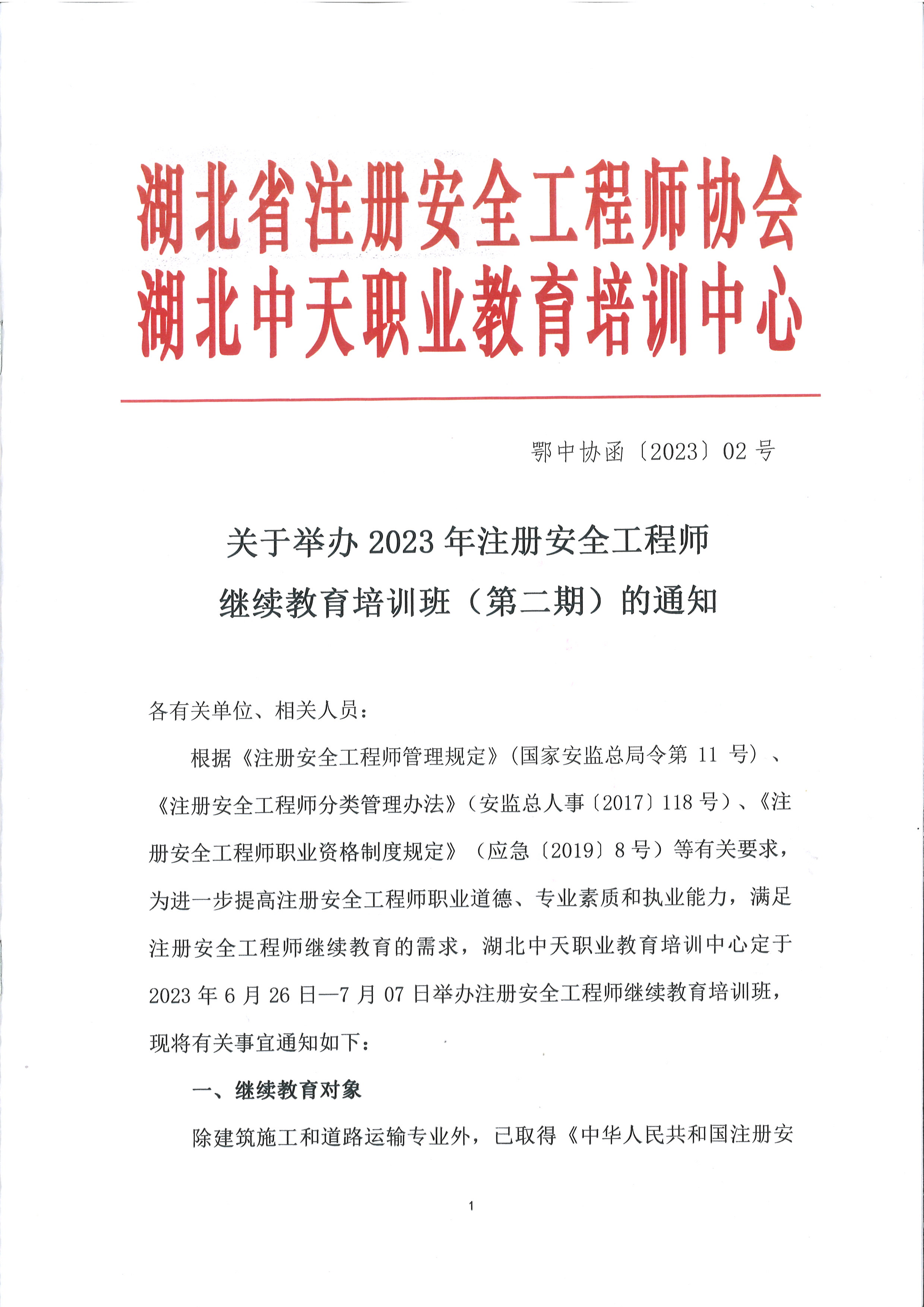 关于举办2023年注册安全工程师继续教育培训班(第一期)的通知