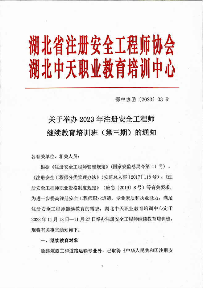 关于举办2023年注册安全工程师继续教育培训班(第三期)的通知